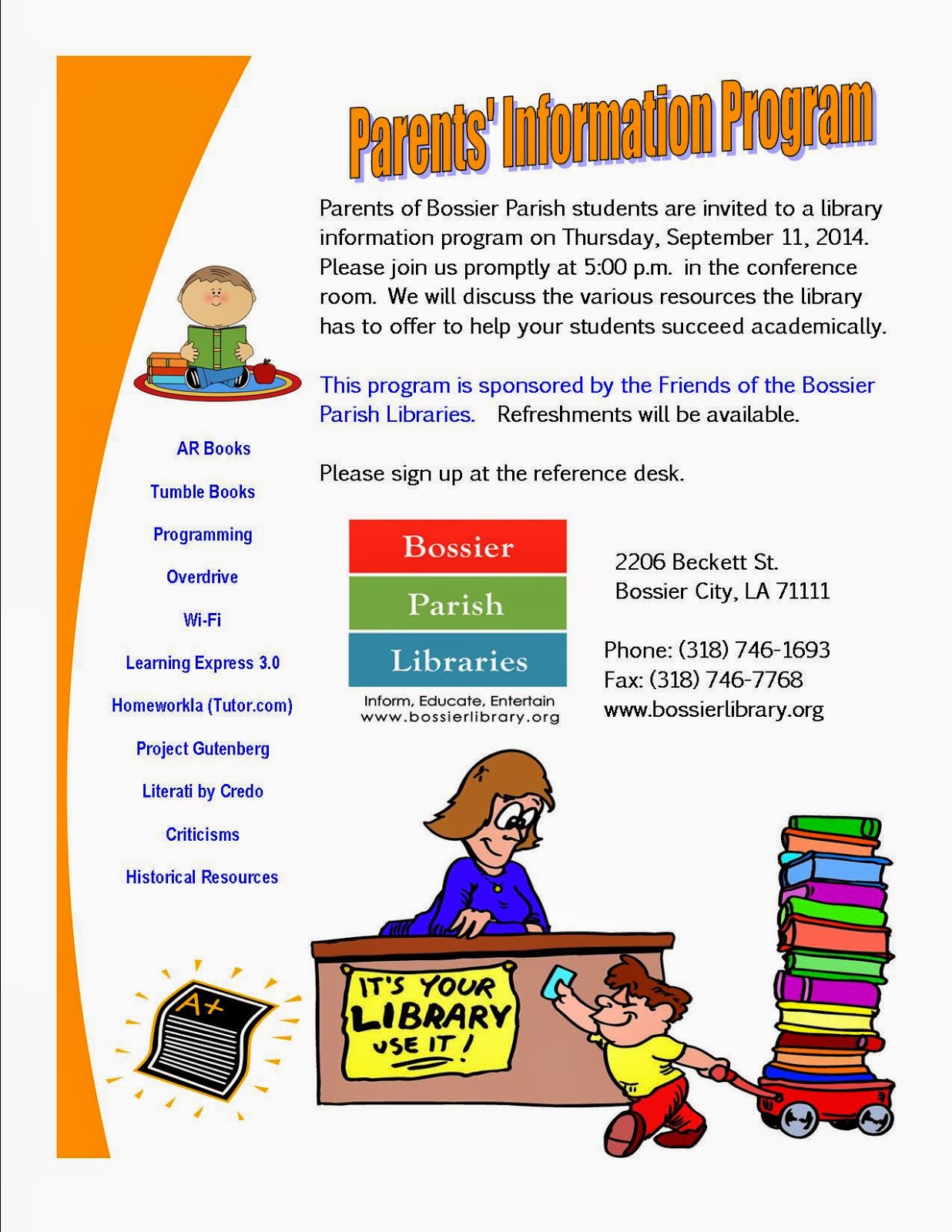 Contact Tonya Oswalt at the Bossier Central Library (318-746-1693) to get more information and/or to sign up!